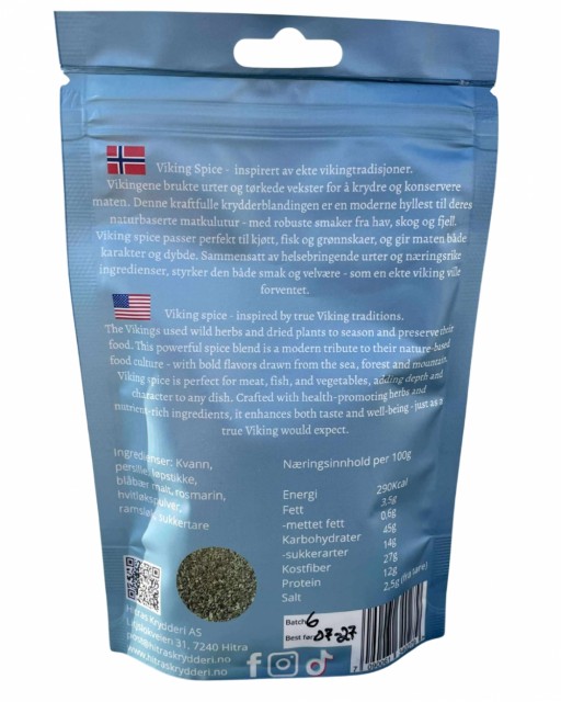 Designet på posen er håndmalt av den lokale kunstneren Astri Reppe, og gir krydderet et unikt, helnorsk preg. Perfekt som gave – både til deg selv og andre. Lett å ta med, lang holdbarhet og en smak som vekker historie og nysgjerrighet gjør dette til en favoritt blant både turister og lokalfolk.